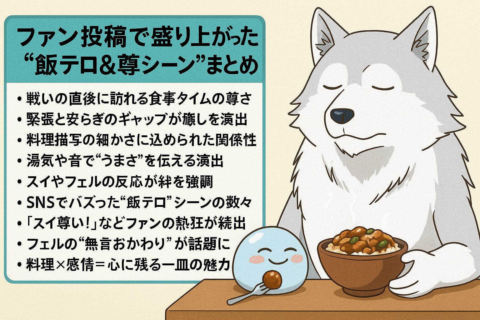 SNSでも「フェルが耳動かしたら飯テロ始まるの草」といった投稿が見られ、視聴者の間でひとつの“飯シーン前兆”として定着しつつあります。