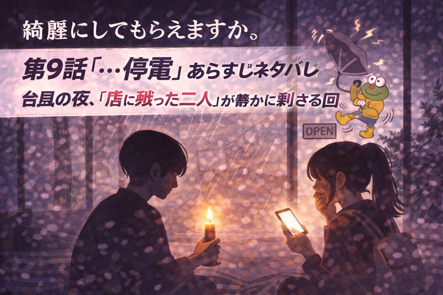 台風で木が折れて、洗濯機が倒れて、ドタバタして終わり――そんなトラブル回に見えるよな。でも9話はそこじゃない。店に残った二人が、暗闇でぽつりぽつりと言葉を落とす。その空気、やけに静かで、やけに刺さる。灯りが戻ったあと、なぜか距離が前と違う。この夜に何が交わったのか――そこを追わないと、この回の本当の重さは見えてこない。
