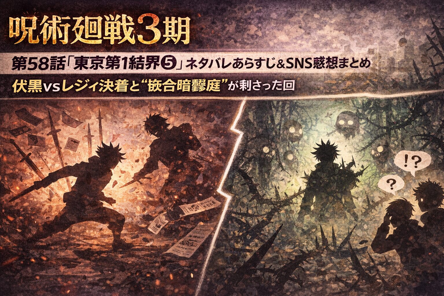 横長に言うと、第58話「東京第1結界⑤」は、伏黒の不完全な領域展開という派手な見せ場を軸にしながらも、逃げたふりから始まる頭脳戦、影と空間を使った戦場の書き換え、レジィの機転としぶとさ、そして満身創痍のまま押し切る消耗戦の重さまで全部を一話の中へ詰め込んでいて、その結果「伏黒がカッコよかった」で終わる回ではなく、「伏黒の戦い方が一番濃く出たうえで、バトルそのものもかなり面白かった回」としてしっかり残る。