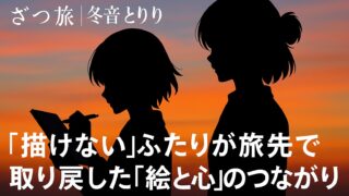キャラの関係性 ざつ旅|冬音とりり|“描けない”ふたりが旅先で取り戻した“絵と心”のつながり 「描きたいのに、描けない。」そんな苦しさを知っている人にとって、冬音とりりの再会シーンは胸に刺さったのではないでしょうか?同じ“創作の壁”にぶつかったふたりが、あえて多くを語らず旅を選んだ理由。実はその裏に、それぞれの“挫折”と“再出発”が... 2025.09.09 キャラの関係性