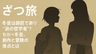 キャラの関係性 ざつ旅|冬音は師匠であり“旅の哲学者”?ちか×冬音、創作と冒険の接点とは “師匠=硬いイメージ”って、なんだか照れちゃいませんか?『ざつ旅』でちかが慕う冬音さんは、実は旅先で妄想をとめどなく膨らませる、自由すぎる漫画家先輩です。この記事では、“師匠なのにノリが最高な冬音”の意外な魅力と、ちかとの創作的な関係性に迫... 2025.09.08 キャラの関係性